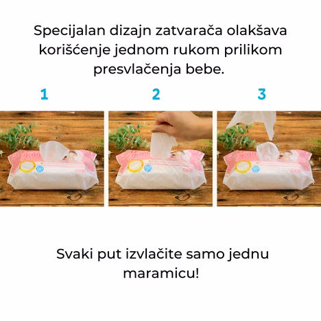 Ako želite da maramice ostanu vlažne maksimalno dugo, otvoreni paket treba čvrsto zatvarati nakon svake upotrebe!
